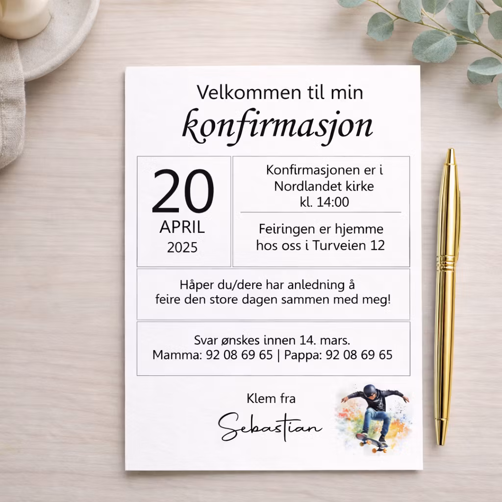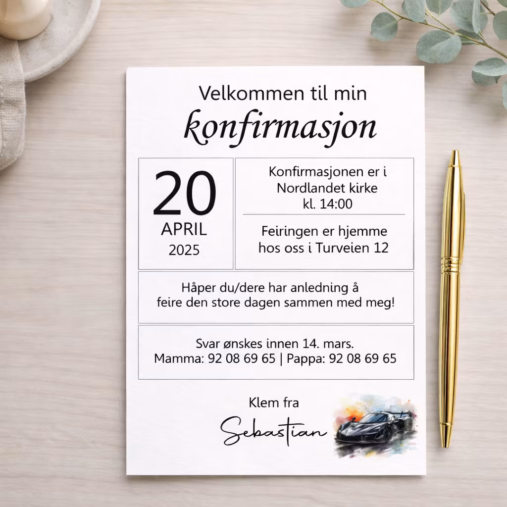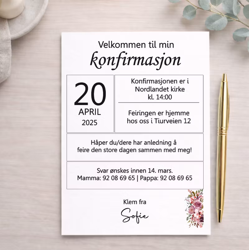 Enkle og rimelige invitasjoner med et pent og oversiktlig design med plass til det viktigste: tid, sted og hvem dagen handler om.