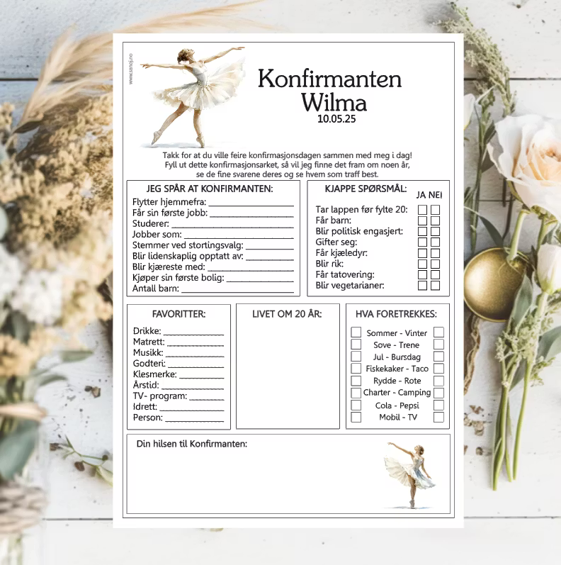 En morsom og hyggelig selskapslek der gjestene fyller ut hva de tror fremtiden bringer, og legger igjen en personlig hilsen til konfirmanten. Arkene samles som et fint minne, og er ekstra koselige å ta frem igjen om noen år – for å se hva gjestene svarte, og om noen av spådommene faktisk slo til.