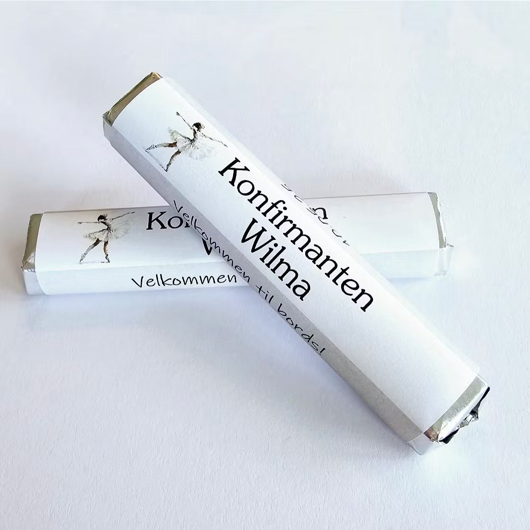 Etiketter til Kinder Maxi, tilpasset samme motiv som konfirmasjonsarkene. Med navn øverst, dato på den ene siden og teksten «Velkommen til bords» på den andre. Perfekt som en gjennomført og personlig detalj på konfirmasjonsbordet. De leveres på A4- ark og klippes ut av kunde. Sjokolade medfølger ikke!