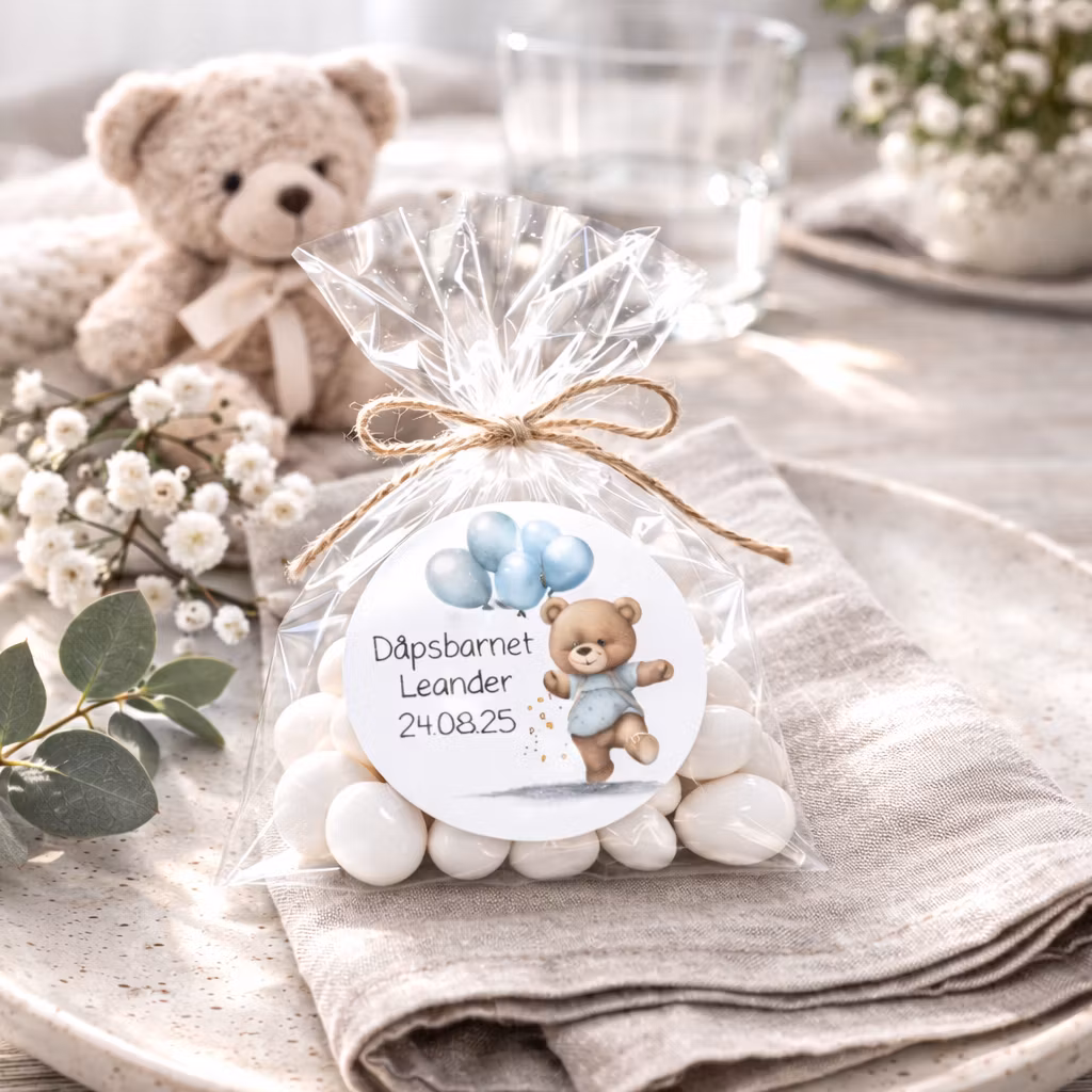 Perfekte å feste på cellofanposer med godteri, men like vakre på små gaveesker, konvolutter, bordkort eller andre små oppmerksomheter til gjestene.