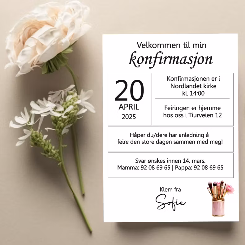 Enkle og rimelige invitasjoner med et pent og oversiktlig design med plass til det viktigste: tid, sted og hvem dagen handler om.