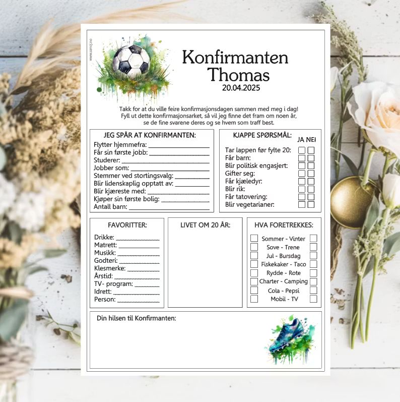 En morsom og hyggelig selskapslek der gjestene fyller ut hva de tror fremtiden bringer, og legger igjen en personlig hilsen til konfirmanten. Arkene samles som et fint minne, og er ekstra koselige å ta frem igjen om noen år – for å se hva gjestene svarte, og om noen av spådommene faktisk slo til.