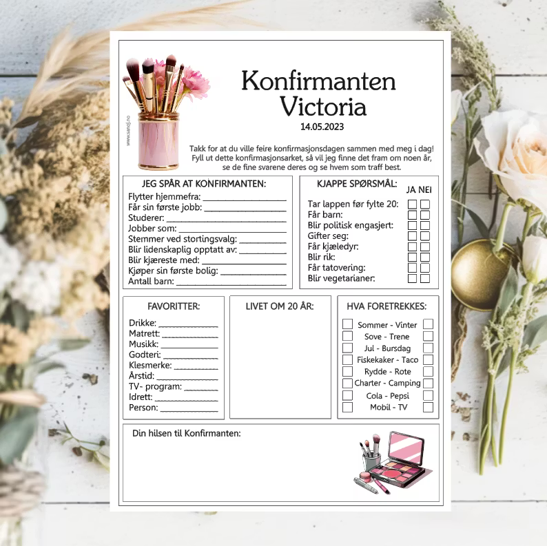 En morsom og hyggelig selskapslek der gjestene fyller ut hva de tror fremtiden bringer, og legger igjen en personlig hilsen til konfirmanten. Arkene samles som et fint minne, og er ekstra koselige å ta frem igjen om noen år – for å se hva gjestene svarte, og om noen av spådommene faktisk slo til.