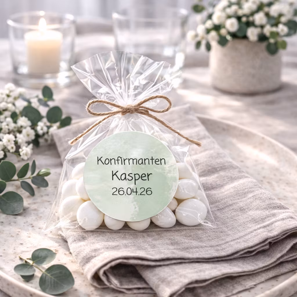 Disse elegante klistremerkene personaliseres med navn og dato, og gir en gjennomført og eksklusiv detalj til den store dagen.
