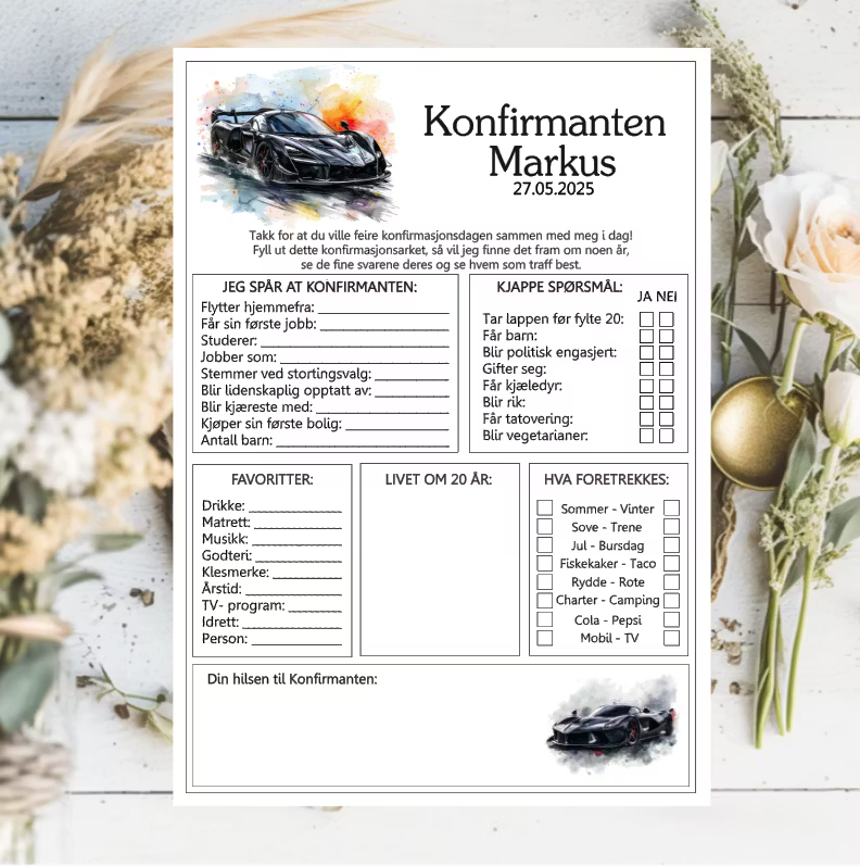 En morsom og hyggelig selskapslek der gjestene fyller ut hva de tror fremtiden bringer, og legger igjen en personlig hilsen til konfirmanten. Arkene samles som et fint minne, og er ekstra koselige å ta frem igjen om noen år – for å se hva gjestene svarte, og om noen av spådommene faktisk slo til.