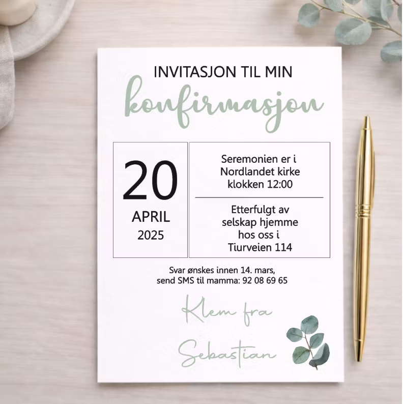 Enkle og rimelige invitasjoner med et pent og oversiktlig design med plass til det viktigste: tid, sted og hvem dagen handler om.