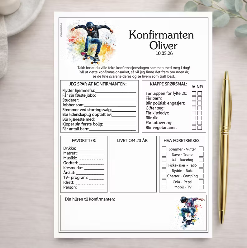 En morsom og hyggelig selskapslek der gjestene fyller ut hva de tror fremtiden bringer, og legger igjen en personlig hilsen til konfirmanten. Arkene samles som et fint minne, og er ekstra koselige å ta frem igjen om noen år – for å se hva gjestene svarte, og om noen av spådommene faktisk slo til.