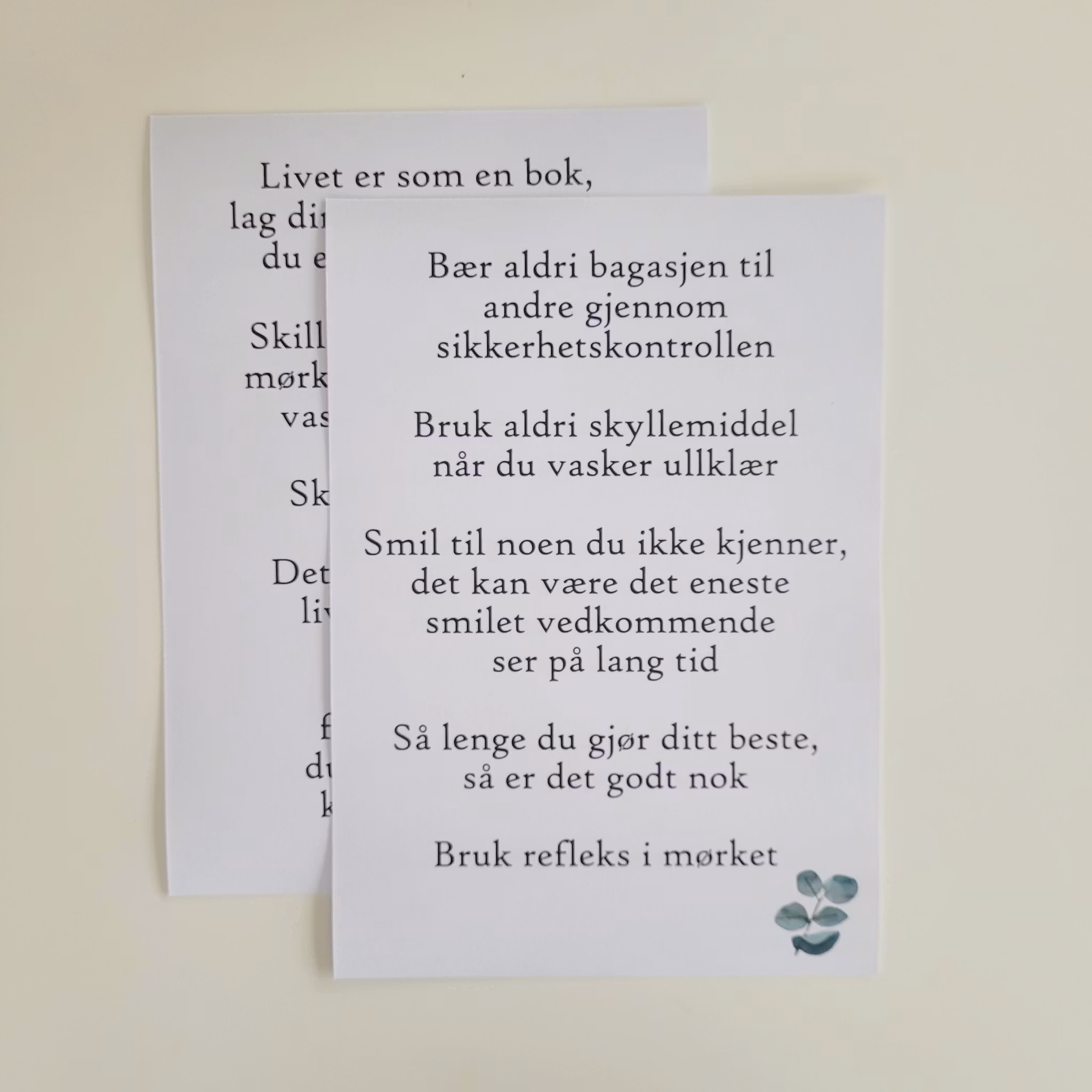 Livsråd til konfirmanten På lager 149,- KJØP Livsråd til konfirmanten 💕Inneholder 10 ark med totalt 50 livsråd + forside.Printet på 250 grams kartong i A6.Pakket inn i cellofan.