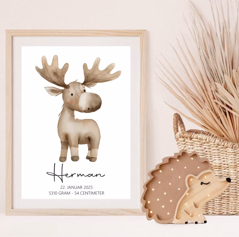 Fødselsplakat - elg På lager 99,- KJØP Nydelig fødselsplakat med barnets navn, fødselsdato, vekt & lengde.Printet på 250 grams papir.Dersom du kun ønsker bildet (uten tekst) - kan du la tekstfeltene stå tomme.Ramme medfølger ikke!