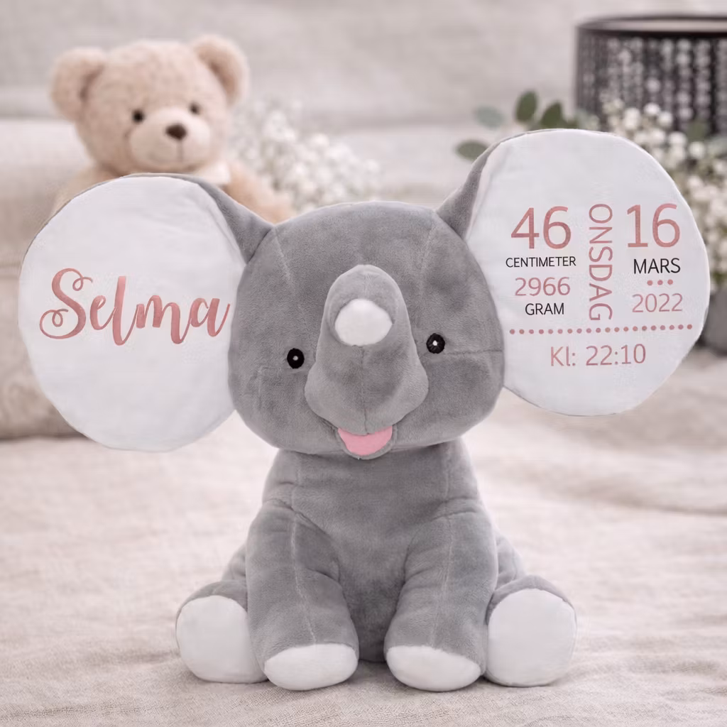 Grå fødselsbamse m/ rosa skrift På lager 599,- KJØP Nydelig elefantbamse med navnetrykk og fødselsdetaljer, passer fint som feks. dåpsgave.Måler ca. 30 cm sittende, ingen løse deler.