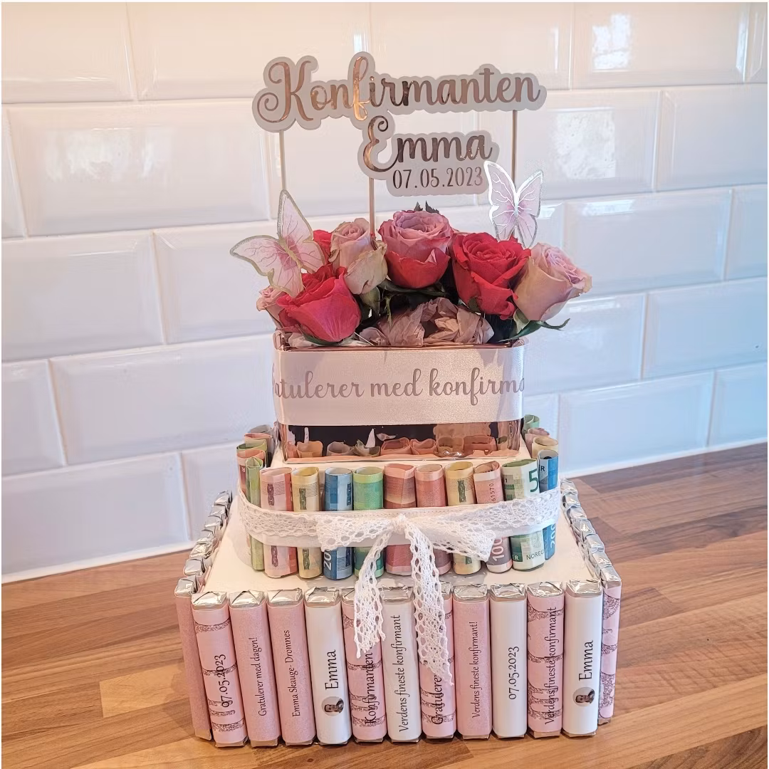 Siste bilde er av ei "sjokoladekake" jeg lagde i konfirmasjonsgave tidligere, der Kinder Maxi- etiketter er blitt brukt.