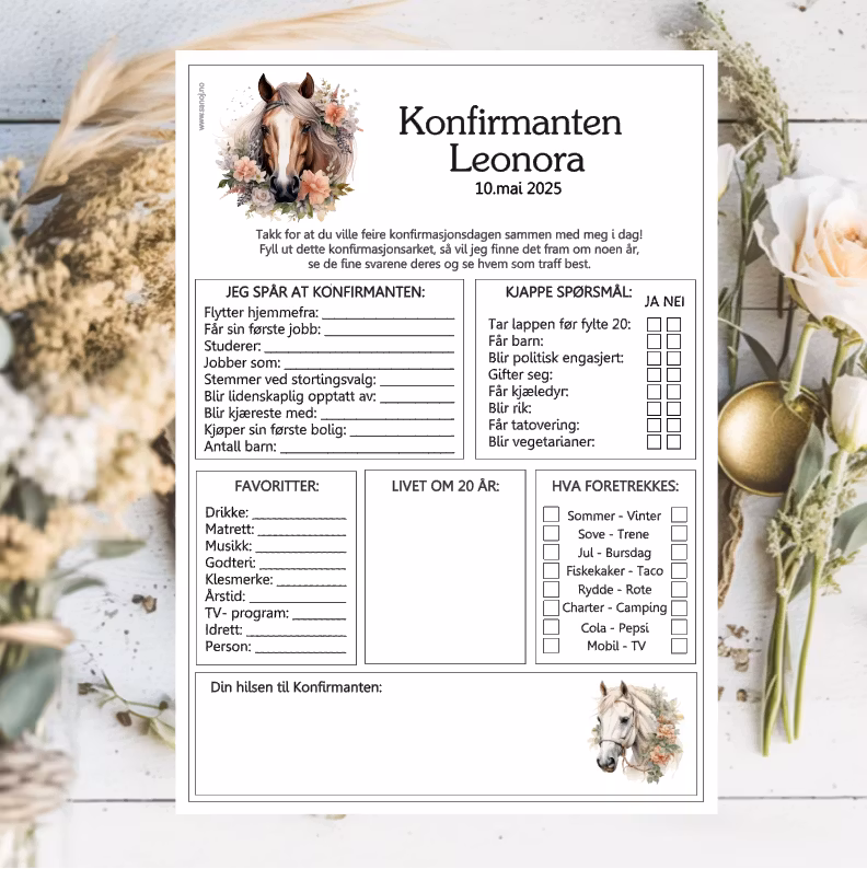 En kjekk selskapslek der gjestene skal fylle ut hva de tror framtiden til konfirmanten bringer, samt legge igjen en liten hilsen,