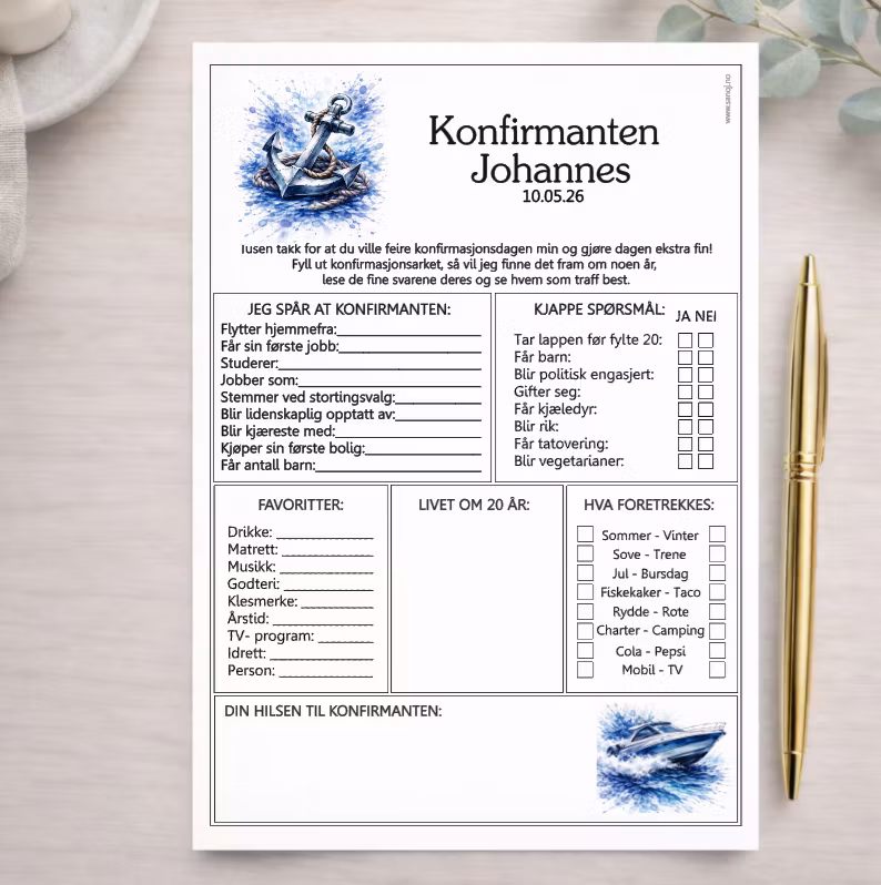 En morsom og hyggelig selskapslek der gjestene fyller ut hva de tror fremtiden bringer, og legger igjen en personlig hilsen til konfirmanten. Arkene samles som et fint minne, og er ekstra koselige å ta frem igjen om noen år – for å se hva gjestene svarte, og om noen av spådommene faktisk slo til.
