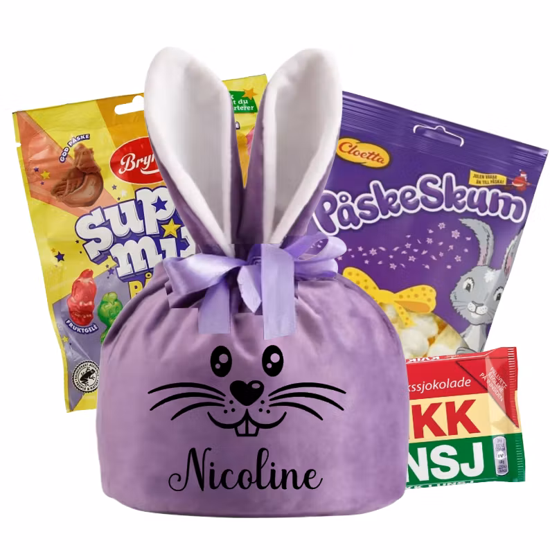 Påskepose m/ godteri (velg farge på posen) På lager Antall: 349,- 249,- @Velg farge: Gul Blå Rosa Krem Lilla Sand KJØP Nydelig påskeharepose i myk velour, foret med bomullstoff på innsiden.Godteriet på bildet medfølger, velg farge på påskeposen i menyen og skriv inn ønsket navnetrykk.Med mål på 18x18 cm + ører.