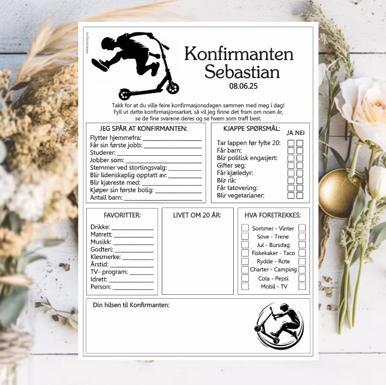 En kjekk selskapslek der gjestene skal fylle ut hva de tror framtiden til konfirmanten bringer, samt legge igjen en liten hilsen,