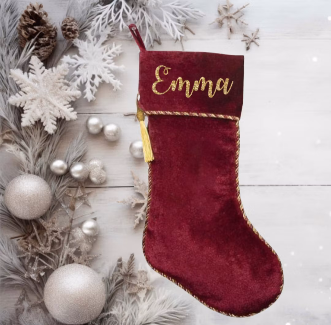 Julestrømpe, rød/gull På lager Antall: 6 299,- KJØP Nyydelig julestrømpe i dyp rød som er kantet med tvinnet bånd i gull & rødt.Fås med valgfritt navnetrykk i glitrende gullskrift.Måler ca. 50 cm, og er foret.Prisen er pr.stk.