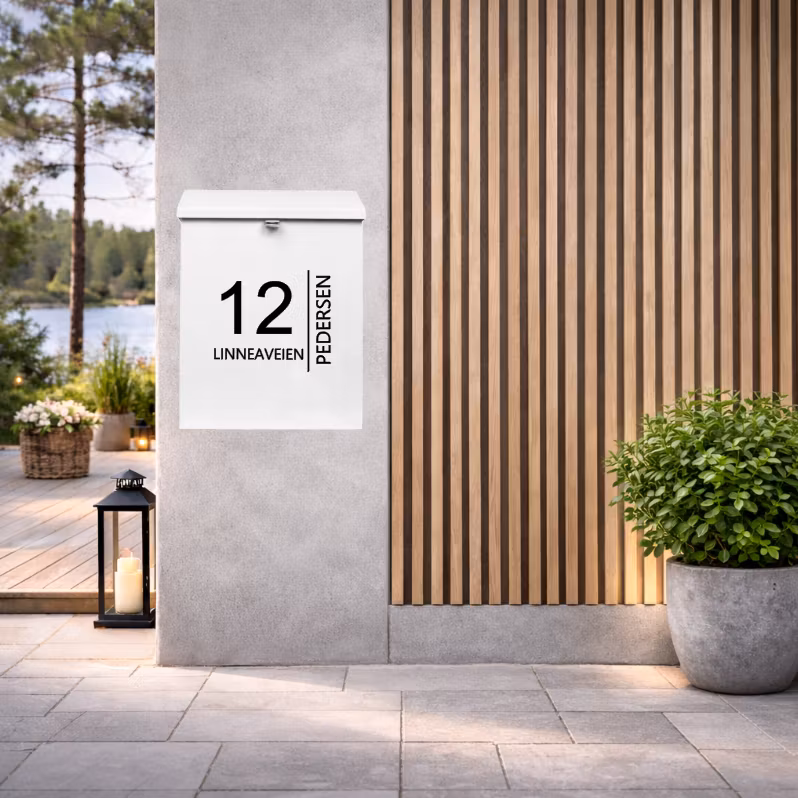 Vinylmerke til å feste på postkassen med stort hustall, samt adresse og etternavn.